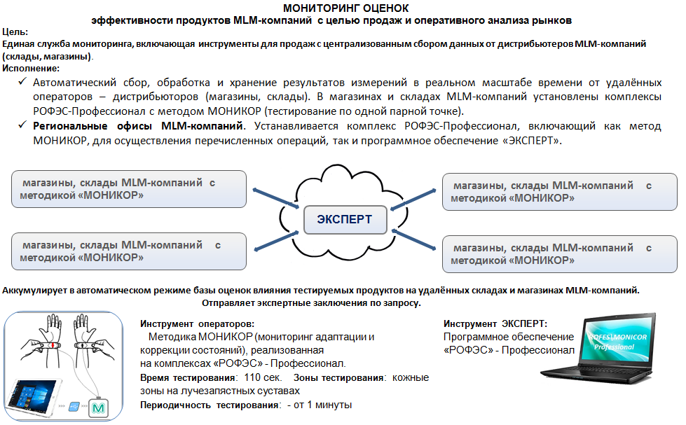 Блок профессионалов врачей и психологов с комплексами «РОФЭС-Профессионал» и специалисты, владеющие методом тестирования «РОФЭС-МОНИКОР/Консультант», объединённые телеметрической системой, предоставляющие качественные услуги тестирования и диагностики с автоматическим расчётом индивидуальных программ эффективного применения продуктов MLM-Компаний: Арго, Сибирское здоровье, КФС, Тяньши, NUTRILITE, Сок PREMIUM NONI, Coral Clab.