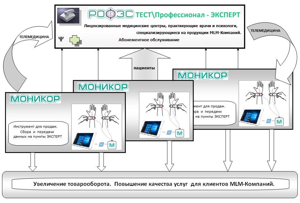 - Предоставляется качественный инструмент для бизнеса: Определяя инструментально уровни здоровья, а не на «глазок», выявляя нагрузки отягощений на организм и индивидуально оценивая эффективность продукции — гарантированно повышается качество обслуживания клиентов MLM-компаний, соответственно, увеличивается оборот продукции.